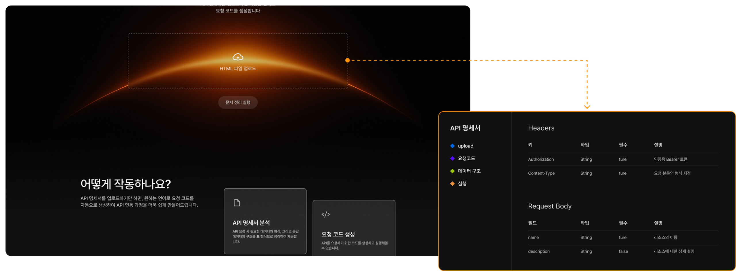 사용자는 HTML 형태의 API 명세서(문서)를 업로드하면, 시스템이 문서를 구조적으로 분석하여 엔드포인트/파라미터/응답 스키마를 추출하고, 목적에 맞는 요청 코드(예: cURL, JavaScript, Python 등)를 자동 생성합니다.